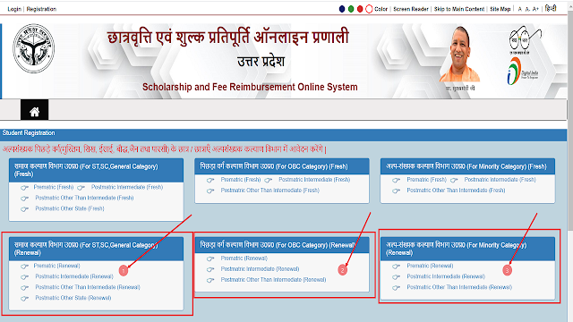 A. ऑप्शन नंबर 1 में ST,SC,General Category के छात्र Renewal कर सकते हैं यहां पर आपको चार ऑप्शन मिलेगा अब जिस गडकरी में आते हैं उस ऑप्शन पर आपको क्लिक कर देना